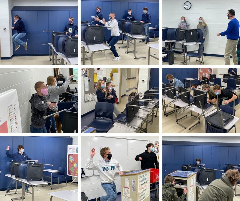 Hands-On History" US history students at THS had some fun while learning about WWI. New technologies like machine guns and hand grenades were represented by paper wads and more paper wads. Trenches were made from desks, and wheeled podiums became the new weapon called the tank. Germany's dilemma of facing a two-front war was on full display when students representing the Central Powers had to deal with the Allies 'attacking' them from both sides of the classroom. Thankfully, students representing America joined the 'fight' at just the right time and powered the Allies on to victory, even after the 'Russians' stopped fighting in the east. Unlike WWI, however, there were no casualties this time around!